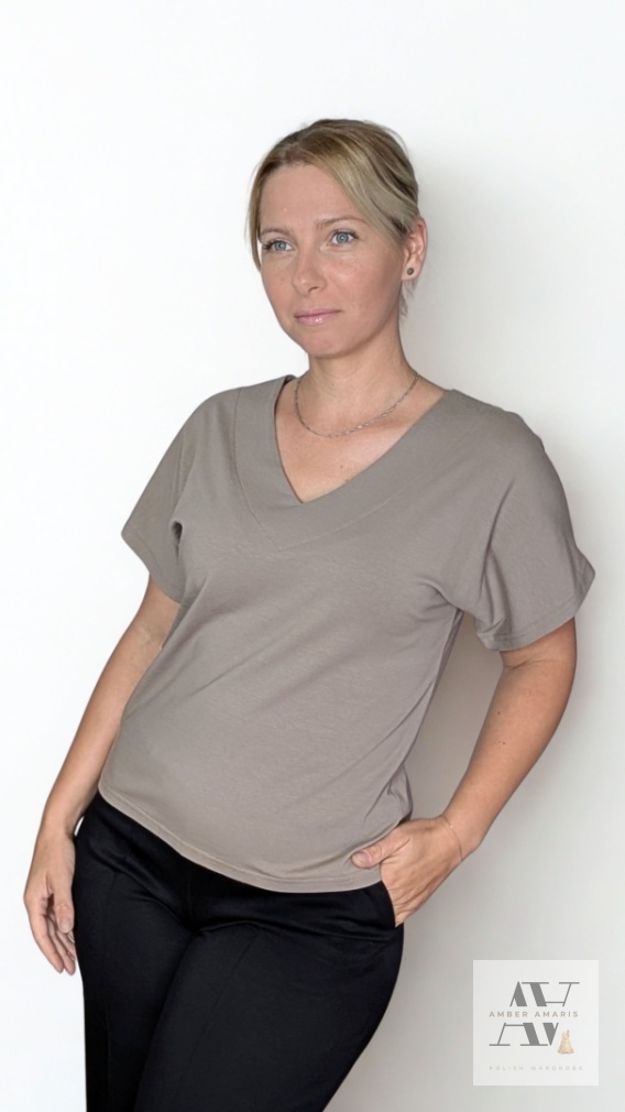 Prosta bluzka o swobodnym kroju, która doskonale sprawdzi się w codziennych stylizacjach na cieplejsze dni. Miękka, elastyczna dzianina przyjemnie układa się na sylwetce i zapewnia komfort noszenia przez cały dzień. Dekolt w serek subtelnie wydłuża szyję i nadaje całości lekkości. Luźne rękawy do połowy ramienia oraz nieopinający fason sprawiają, że bluzka wygląda świetnie na różnych typach sylwetek. To baza, do której z łatwością dobierzesz resztę garderoby – od sportowych po bardziej eleganckie elementy.